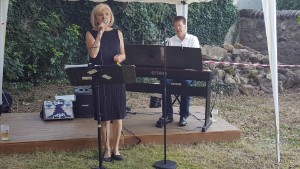Nicht zu vergessen der Verkaufsstand mit Büchern, Honig und Marmelade, der gut besuchte Kaffee- und Kuchenstand und die üppig arrangierten Käseteller, die die vom Speeter-Team angebotenen Speisen ergänzten.Das Duo Blue Eyes, Elli und Jürgen Menge, umrahmte die Veranstaltung musikalisch mit französischen und deutschen Chansons.Gut angenommen bei den heißen Temperaturen wurde auch Angelo de Zordos Eiswagen: 30% der Einnahmen erhielt der Verein als Spende. Weitere Erlösen wurden durch die Versteigerung der alten Zifferblätter, eines Zeigers der Kirchturmuhr und den Verkauf von vier riesigen Orgelpfeifen erzielt.